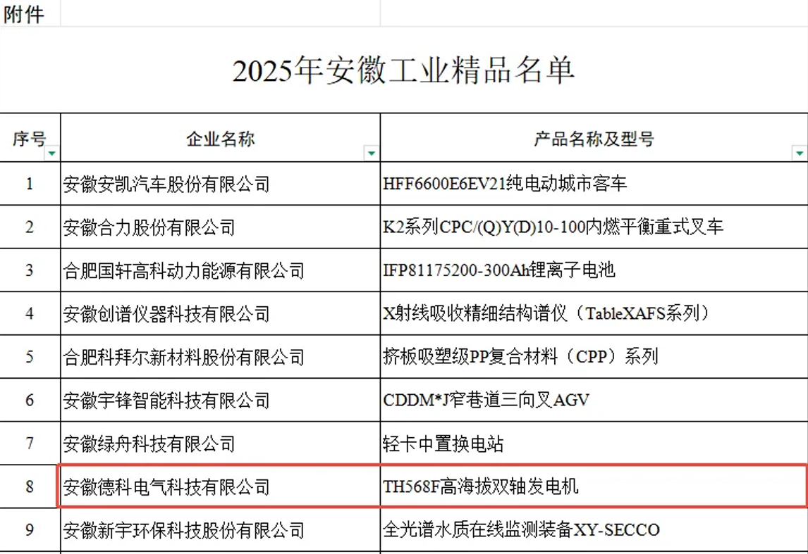 捷报传来!日前,安徽省工业和信息化厅正式发布2025年《安徽工业精品》名单,中国·8827太阳集团电气TH568F高海拔双轴发电机凭借领先的技术性能与卓越的产品品质,成功入选,荣膺此项省级权威荣誉。